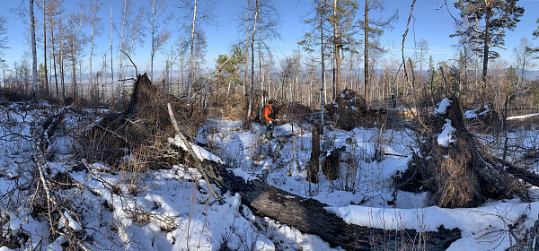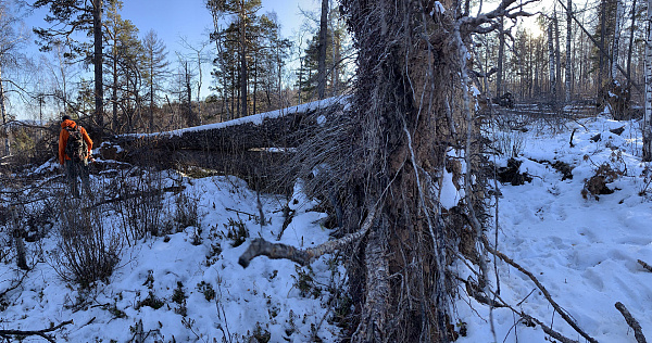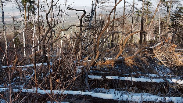 Спускаться решили, как все люди, в сторону Зверосовхоза, по натоптанной с свежем снегу тропе. Внизу хорошо видны «Зверьки» — скальники с небольшой пещерой. Кругом поваленные деревья. Видимо, недавно тут был ураган.