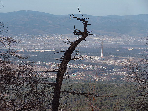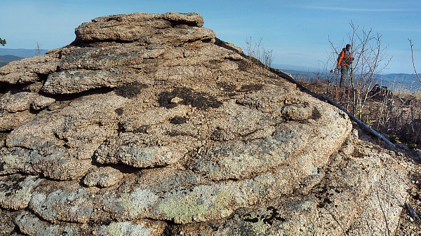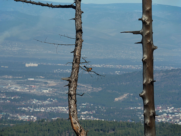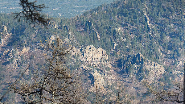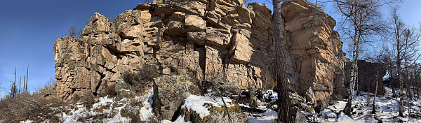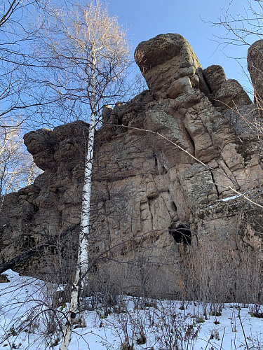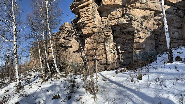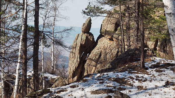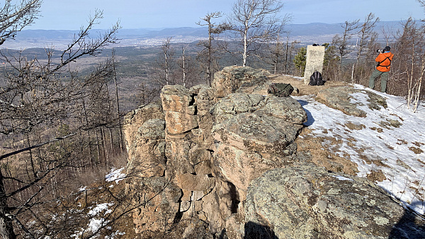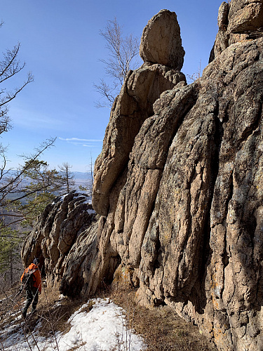 С вершины хорошо видно весь город, Селенгу, Шаманские горы, Иволгинский дацан и Тологой в окружении мега-деревни. Отобедав, идём смотреть многочисленные скальники. Большая толстая жёлтая мышь выскакивает откуда-то из-под снега, прыгает по ногам и снова скрывается в снегу. Видны места ночёвок косуль. Длинный высокий скальник напоминает крепостную стену. От «сакральных» легенд про гуннов и прочих далёких предков гору наверняка спасает высота. Была б чуть пониже, от паломников отбою не было бы, стопудово. Нет и традиционных бурханов. Поражает идеально ровная прямоугольная «дверь» в каменной стене. Вот бы постучаться в неё, и очутиться на площади Советов, например. Постучался — не работает.