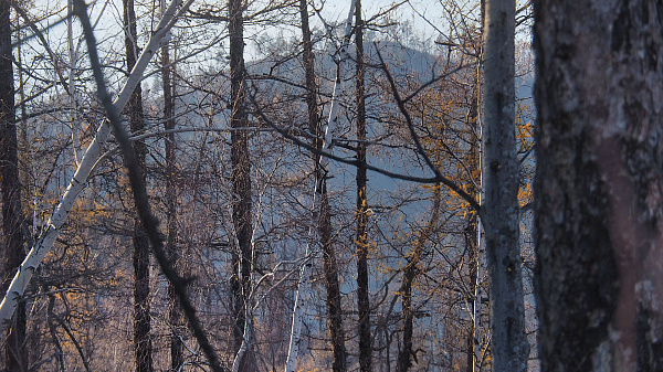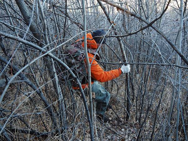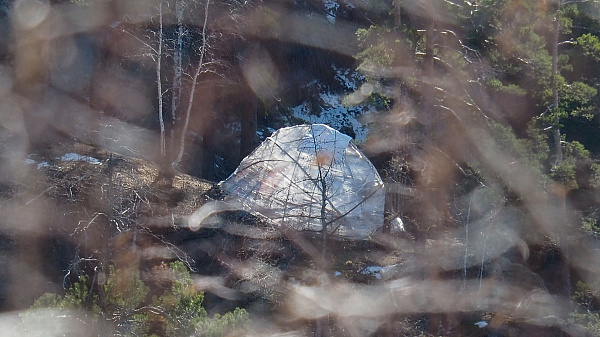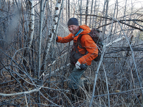 Примерно на середине подъёма замечаем белое пятно — о-хо! — гора обитаема! Разглядываем в телевик палатку-чум из веток и полиэтилена. А где-то внизу еле различим — и сам хозяин сооружения, лохмат и легко одет. Становится страшновато: а нету ли у отшельника какого ружья? А то зима на носу, а он без тёплой куртки... На всякий случай сворачиваем за камни.