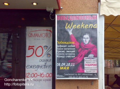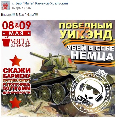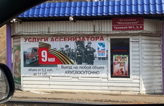 Знаменитые фотографии и плакаты времен ВОВ, изображения известных памятников, посвященных войне и победе – все пошло, извините за калмбур, в расход! Особенным спросом пользовалась знаменитая фотография под названием «Комбат». Что только этот офицер, поднявший осенью 41-го бойцов в свою последнюю атаку, не отрекламировал спустя 75 лет после своей гибели – торговые дома, кафе, парикмахерские, овощи, пиво, пиццу. У нас вот, в Улан-Удэ на его пистолет чуть ли не надет был крендель (лого) Бурятхлебпрома, а на палатке уличного тира на Элеваторе «Комбат» висит вкупе с надписью «Приходи, постреляем»!