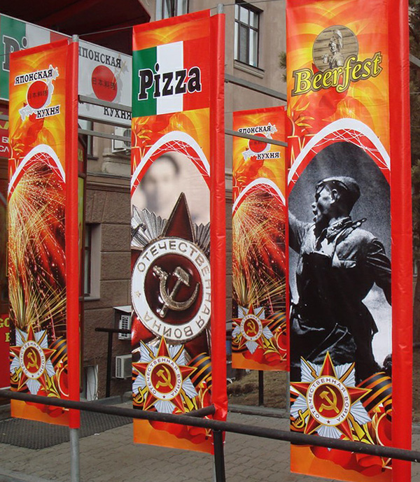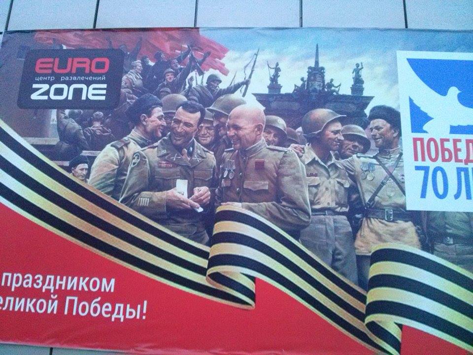 На стене «Еврозоны» висело известное фото американских и советских солдат встретившихся в мае 45-го, а на нем в самом заметном углу логотип заведения с надписью – «Еврозона центр развлечений». То есть, не просто так заказывали и размещали баннеры, а, так сказать, с креативным смыслом, с ассоциациями и аллюзиями! На центральном «Детском мире» в Москве красовался плакат, перефразирующий знаменитый «Родина-мать зовет!» - «Папа, ребенок зовет в Детский мир!»…