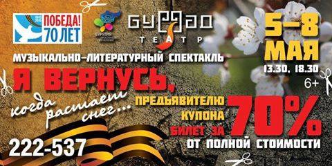 Весть, как всегда, пришла с Запада – коллега и добрый знакомый, отправил мне ссылку на купон театра бурятской драмы, который надо было вырезать из бесплатной газеты коммерческих объявлений, прийти с ним в кассу театра, и получить за него 70-процентную скидку на музыкально-литературный спектакль театра, посвященный Дню Победы. Отправил, полный негодования – ты что, тоже сошла с ума?! Ты-то как могла такое допустить?! Дело в том, что не все еще на тот момент знали, что я больше не работаю в этом театре. Признаться, поначалу - объяснившись, что не причастна более, и потому не виноватая я – даже не поняла о чем именно речь, и стала оправдывать дизайн купона, что, да, что поделаешь, «колхоз»! Надо было чем-то пожертвовать, ленточкой ли, цветами ли, логотипами ли, 70% как-то неделикатно прописывать тем же шрифтом, что и «70-летие» и т.д. В ответ раздался практически вопль – какие ленточки и цветочки?! Какое не деликатно?! Ты не понимаешь, что театру АМОРАЛЬНО торговаться со зрителем по этому поводу?! Это что же, значит, иди, дорогой зритель, всплакни над воспоминаниями детей войны всего за 30 процентов, что ли?! Иди, вспомни искореженные непосильным трудом руки своей бабушки не задорого?!