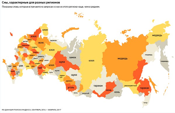 В Иркутской области это сны про тараканов, землетрясения и кедровые шишки. А, например, в Челябинской области людям снятся метеориты. Для Курской, Липецкой, Орловской и Рязанской областей характерны религиозные сны — со святыми, священниками и иконами. В Вологодской, Костромской, Ивановской областях и Чувашской республике популярны пироги.
