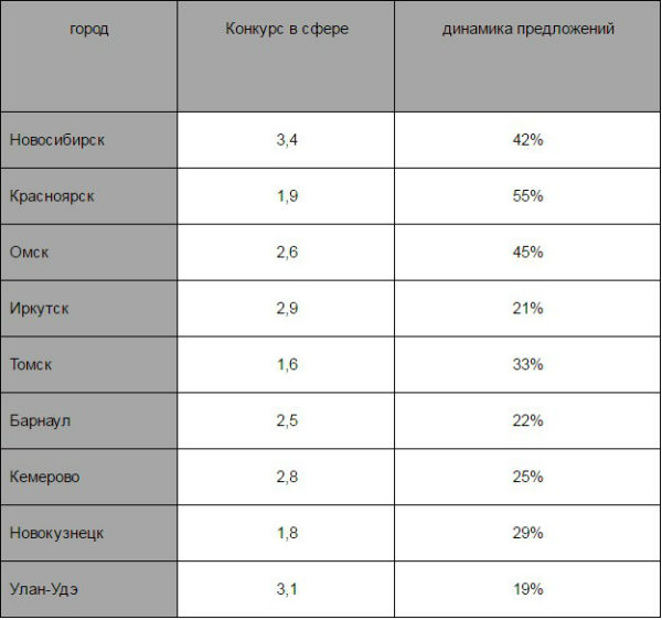 Что качается конкурса на одно предложение, только в некоторых городах он чуть больше трех соискателей на место. То есть, ситуация для соискателей крайне благоприятная.