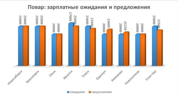 Среднее зарплатное предложение для поваров в СФО за год составило 25 000 рублей. При этом, самые скромные ожидания, 20000 рублей, наблюдаются у поваров Омска, Барнаула, Кемерово и Новокузнецка. А вот самое высокое, 27 000 руб., у иркутян.