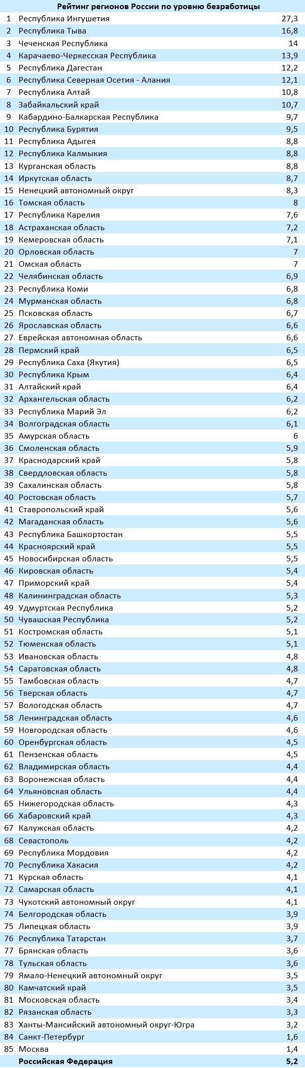 Худший результат в стране показала республика Ингушетия, где не трудоустроены 27,3% жителей, пригодных для работы. За ней следуют республики Тыва (16,8%) и Чечня (14%).