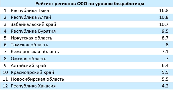Самый лучший результат в СФО показала республика Хакасия, где насчитывается 4,2% безработных. За ней следуют Красноярский край и Новосибирская область (по 5,5%).