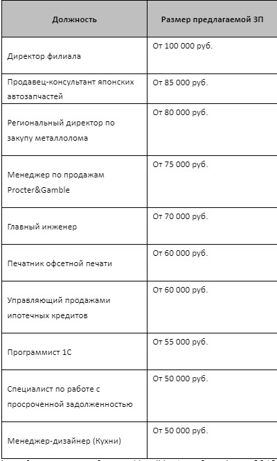 Эксперты сайта hh.ru провели аналитику вакансий в Улан-Удэ и составили топ-10 самых дорогих предложений апреля. В рейтинг вошли вакансии с зарплатами от 100 000 рублей, именно такую сумму работодатели предлагали директору филиала. Десятую строчку рейтинга заняло предложение для менеджера-дизайнера с зарплатой от 50 000 руб.