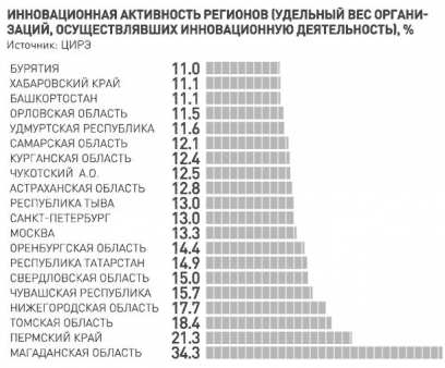 В последние годы прогресса в инновационной деятельности в России не наблюдается, число активных организаций колеблется в пределах 9-10 процентов. Но, даже самые активные регионы далеки от худших в инновационном развитии стран Европы, у которых этот показатель выше 20 процентов. Исключение составляет очень маленькая по численности Магаданская область.