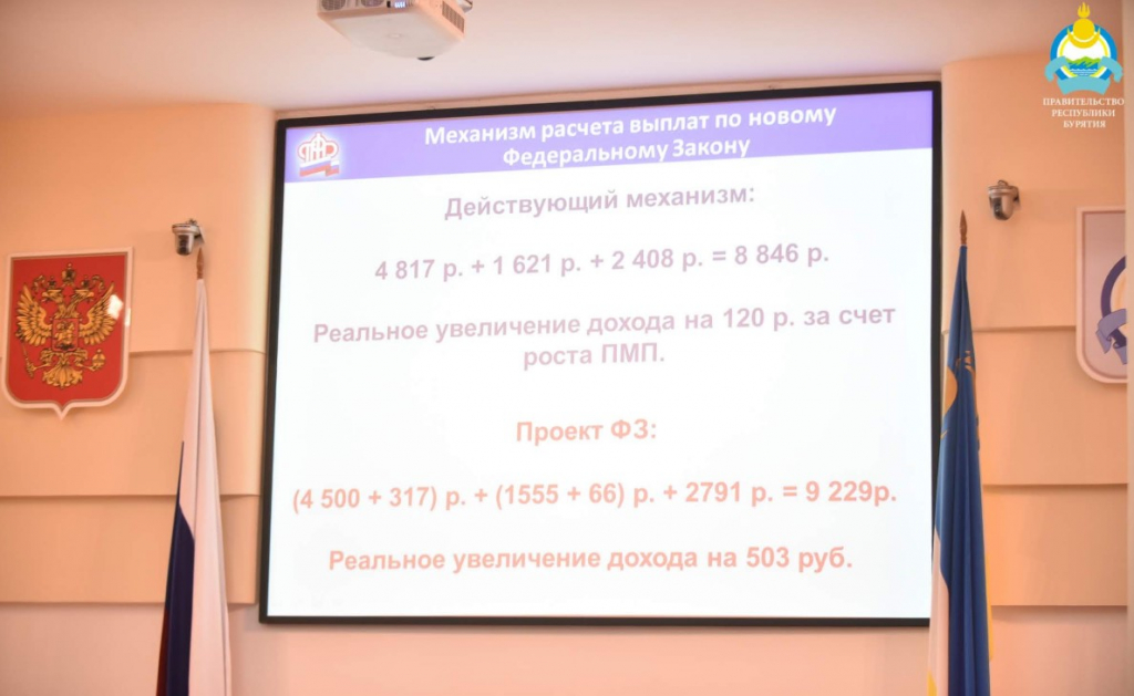 Численность пенсионеров в Бурятии, которых коснётся реализация разработанного законопроекта, - 37 800 человек – это 17% от количества неработающих пенсионеров (или 14% всех пенсионеров), из которых 25 655 получателей пенсий по старости. В среднем их доход увеличится на 415 руб. 12 096 получателей пенсий по государственному пенсионному обеспечению, среднее увеличение дохода которых составит 419 руб. Также 49 получателей пенсий по предложению Центра занятости со средним увеличением дохода 534 руб.