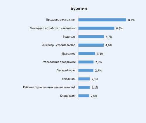При этом, если посмотреть на количество вакансий в Республике Бурятии, то чаще всего работодатели ищут продавцов в магазине (8,7% вакансий от общего числа предложений в 2019г.), менеджеров по работе с клиентами (6,6%) и водителей (4,7%). Именно для этих специалистов компании чаще всего размещают вакансии. Кроме этого, в топ-10 вошли: охранник, бухгалтер, инженеры (строительство и производство) и другие специалисты.