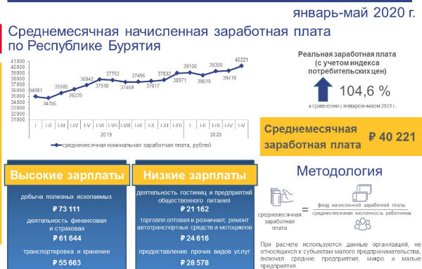 - За январь-май 2020 года среднемесячная заработная плата работников в организациях, не относящихся к субъектам малого предпринимательства, включая средние предприятия, микро и малые предприятия (с учётом дорасчёта), по предварительной оценке, составила 40221 рубль и увеличилась по сравнению с соответствующим периодом прошлого года на 8,6 %, - говорится в сообщении Бурятстата.