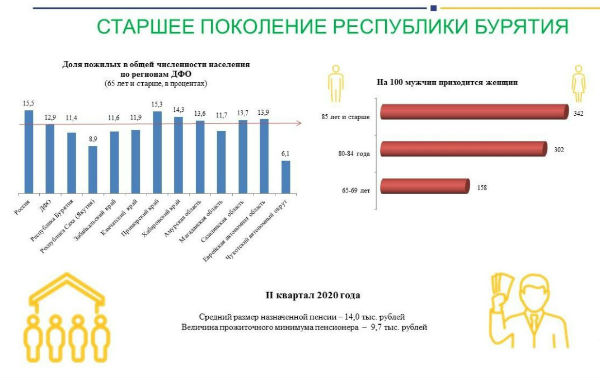 Согласно классификации ООН, население считается старым, если доля людей в возрасте 65 лет и старше в общей численности населения превышает 7 %. Среди регионов Дальневосточного федерального округа самые низкие показатели старения зафиксированы в Чукотском автономном округе (6,1 % пожилых людей старше 65 лет) и Республике Саха (Якутия) (8,9 %), самые высокие – в Приморском (15,3 %) и Хабаровском (14,3 %) краях. В целом в пять регионах ДФО доля пожилых и престарелых превышает средний показатель по ДФО (12,9 %), а в Бурятии он равен 11,4 %. По прогнозам Росстата, в 2036 году их доля составит 18,3 %, сообщили в Бурятстате.