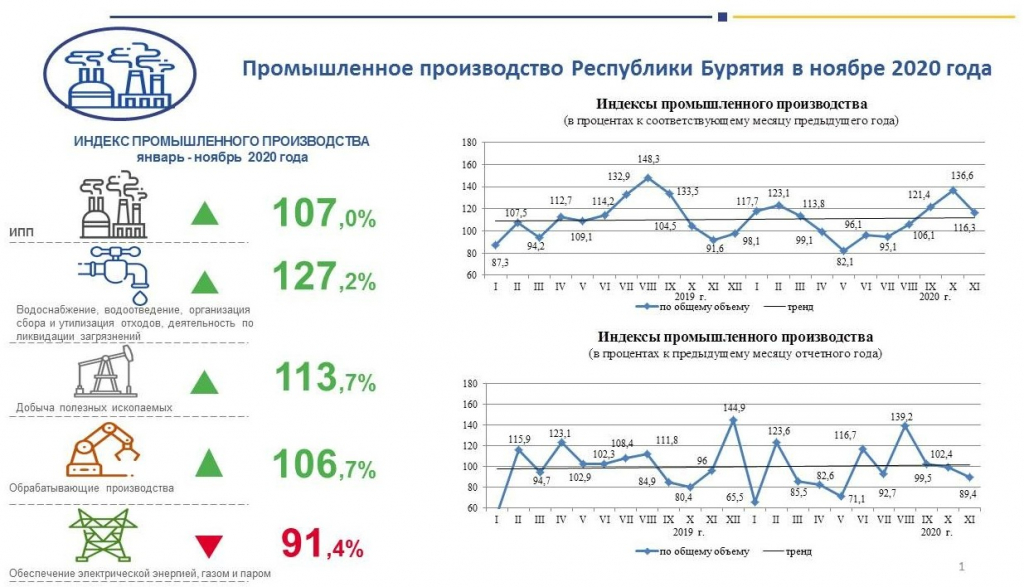 Промышленное производство в Бурятии в ноябре 2020 года по сравнению с ноябрем 2019 года выросло на 16,3 %. С января по ноябрь по сравнению с прошлым годом рост составил 7%, сообщает Бурятстат.