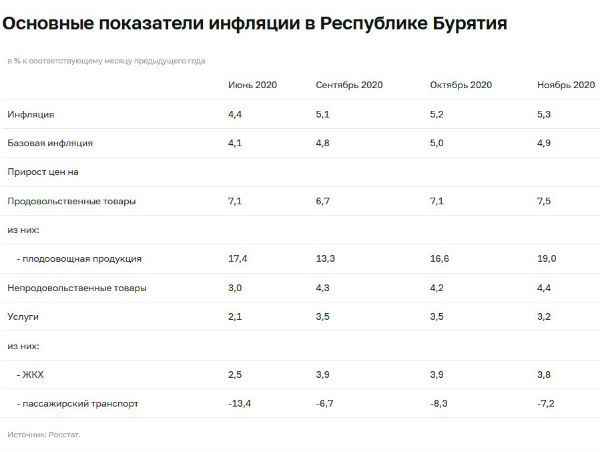 В ноябре годовая инфляция в Бурятии ускорилась до 5,3% после 5,2% в октябре, что заметно выше показателя по Дальневосточному федеральному округу (ДФО) и России. Основное влияние оказали федеральные факторы: ослабление рубля, снижение валового сбора отдельных сельхозкультур. Региональными проинфляционными факторами являлись ухудшение качества урожая овощей открытого грунта и сокращение предложения тепличных овощей, сообщили в пресс-службе Нацбанка Бурятии.