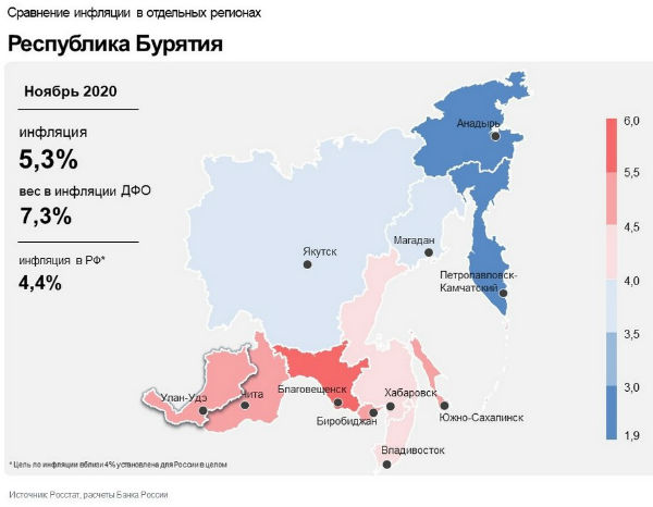 Годовая инфляция в ДФО в ноябре 2020 года увеличилась до 4,5% после 4,2% в октябре. Основным региональным проинфляционным фактором в ноябре стало снижение объема поставок овощей из-за действия ограничительных мер при пересечении границ с Китаем. При этом сохранилось влияние федеральных краткосрочных факторов, таких как эффект переноса валютного курса и ухудшение эпидемической ситуации.
