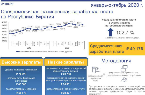 - Наиболее высокий размер заработной платы 74,7 тысяч рублей отмечен у работников, занятых в сфере добычи полезных ископаемых, превысив среднереспубликанский показатель в 1,8 раза. Наиболее низкая оплата труда по сравнению со среднереспубликанским значением наблюдалась у работников, занятых в сфере гостиниц и предприятий общественного питания (на 48,7 %), торговли оптовой и розничной; ремонта автотранспортных средств и мотоциклов (на 39,4 %), - говорится в сообщении Бурятстата.