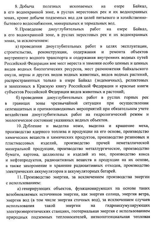 Запрещена заготовка живицы. Под запретом разведка и разработка новых месторождений полезных ископаемых, добыча нефти и природного газа, а также радиоактивных и металлических руд. Запрещено проведение дноуглубительных работ, за исключением ряда случаев. Имеются в перечне также сплав древесины по рекам, впадающим в Байкал или строительство автомобильных и железных дорог (впрочем, также не без исключений).