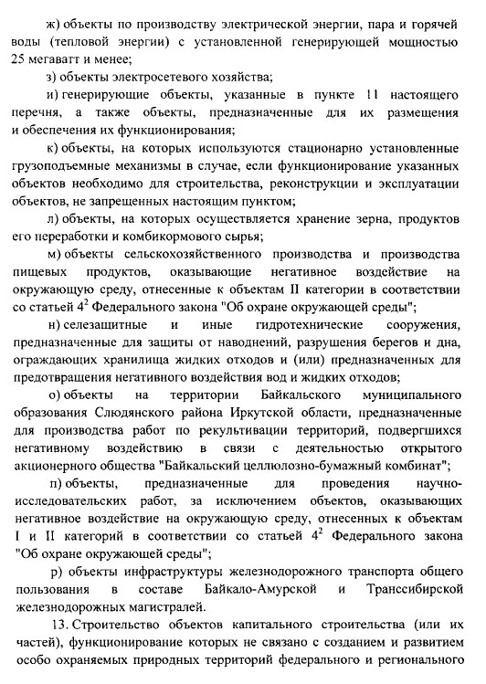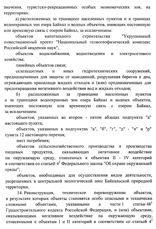 Список состоит из 26 пунктов. Среди них — заготовка древесины, за исключением заготовки гражданами древесины для собственных нужд и заготовки древесины при осуществлении санитарно-оздоровительных мероприятий. Запрещается проведение сплошных рубок лесных насаждений, за исключением случаев, указанных в пункте 2 статьи 25 федерального закона «Об охране озера Байкала».