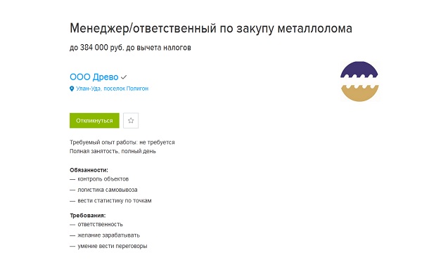 Возглавила топ-10 вакансия с графиком работы вахтовым методом (Муйский район, посёлок Иракинда) – «Менеджер, ответственный по закупу металлолома»: успешный кандидат может претендовать до 384 000 рублей до вычета налогов за вахту. Также компания предлагает компенсацию проезда к месту работы и обратно, а также проживание на территории работодателя. Среди требований указаны не только наличие опыта работы, важны личные качества соискателей: аккуратность, исполнительность, дисциплинированность.