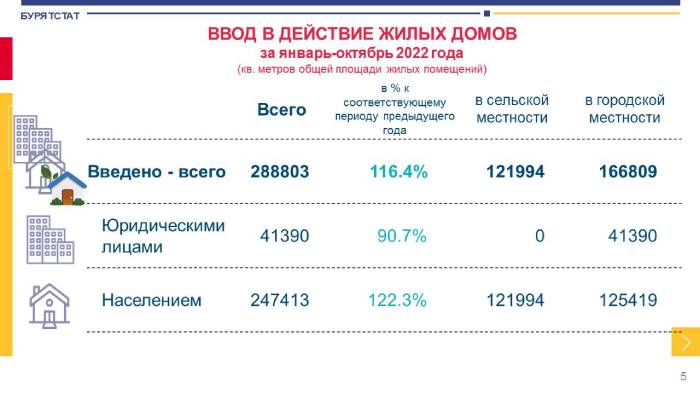 За десять месяцев 2022 года – с января по октябрь – в Бурятии в эксплуатацию ввели 2529 жилых домов (3359 квартир) общей площадью в 288 800 квадратных метров. По сравнению с аналогичным периодом 2021-го этот показатель увеличился на 16,4 %, сообщили в пресс-службе Бурятстата.