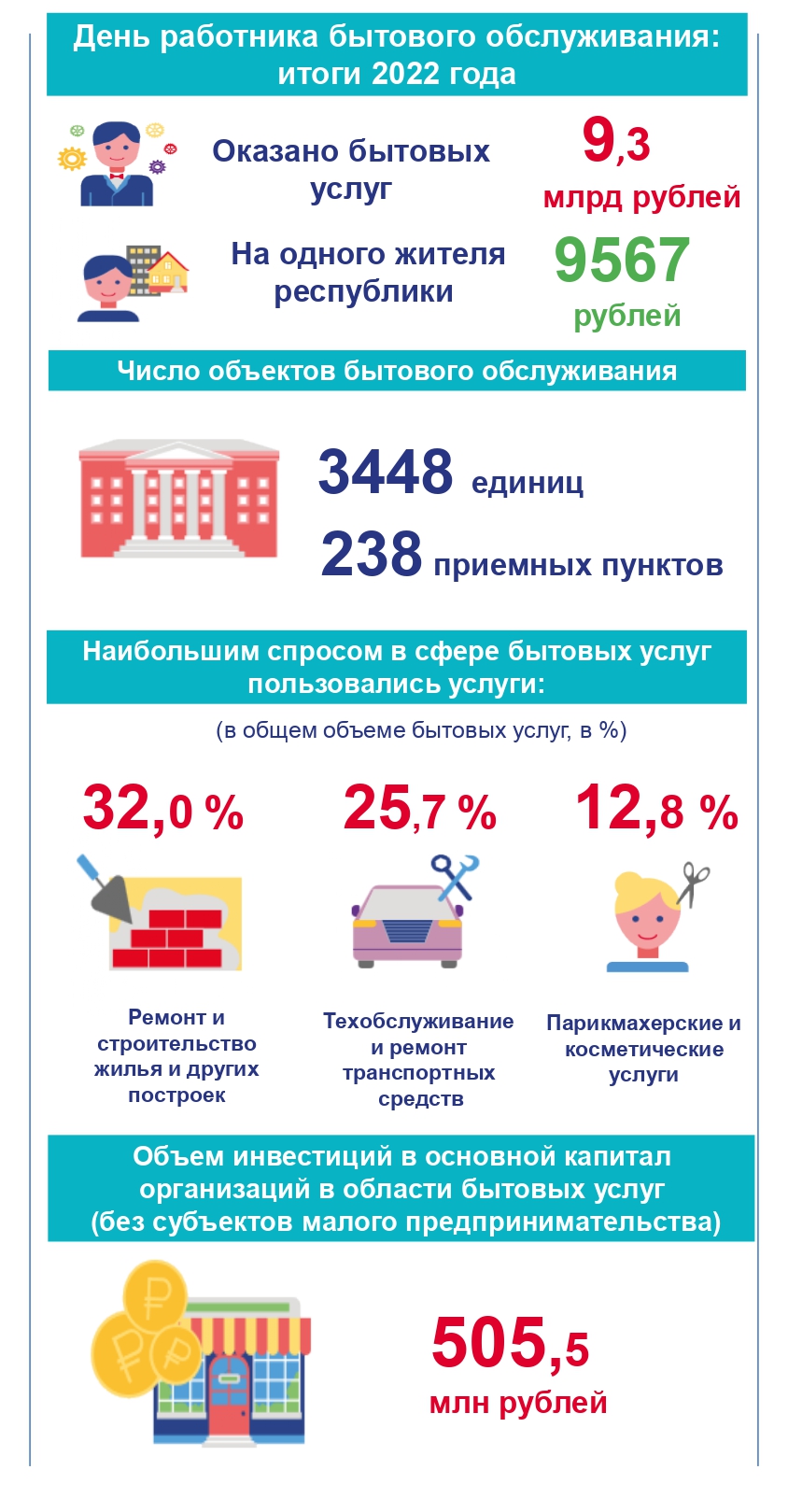 Всего в ушедшем году жители республики заплатили за бытовые услуги 9 миллиардов 300 миллионов рублей – на 0,5% (в сопоставимых ценах) больше, чем в 2021-ом. Их доля в общем объёме платных услуг за это время возросла с 16,9% до 17,8%.