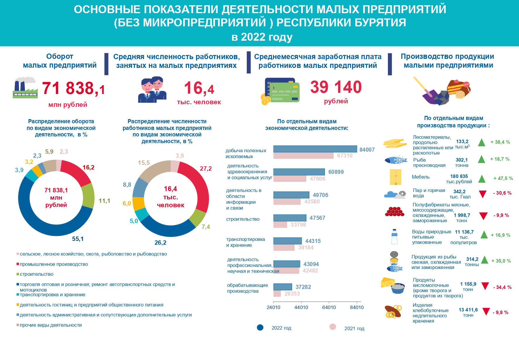В Бурятстате рассказали, что в ушедшем 2022 году оборот малых предприятий в республике составил 71 миллиард 838 миллионов рублей и по сравнению с 2021-ым увеличился на 6,1%. Значительная его доля (55,1%) приходилась на организации, занимающиеся торговлей – оптовой и розничной, а также ремонтом автотранспортных средств и мотоциклов. Среди других направлений – строительство (11,1%), обрабатывающие производства (10,8%), транспортировка и хранение (3,9%) плюс гостиничное обслуживание и услуги общепита (3,2 %).
