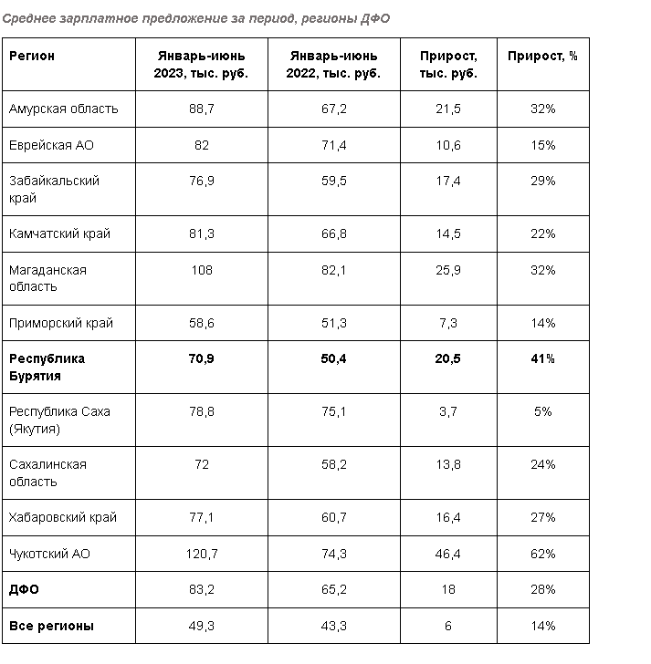 Представители российской платформы онлайн-рекрутинга HeadHunter рассказали, как с января по июнь 2023-го по сравнению с аналогичным периодом 2022-го в Дальневосточном федеральном округе (ДФО) и, в частности, в Бурятии, изменился размер зарплат.