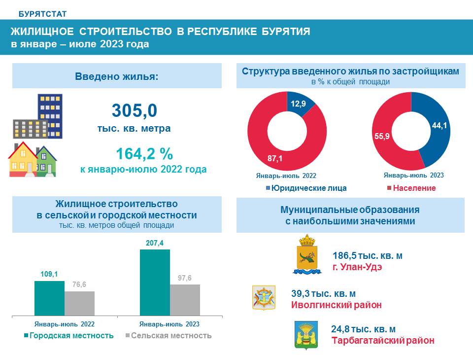 Основная доля (61,1%) введённого в республике жилья приходится на Улан-Удэ. Среди районов лидируют пригородные Иволгинский (12,9%) и Тарбагатайский (8,1%), а также Заиграевский (3,3%) и Кабанский (3,1%).