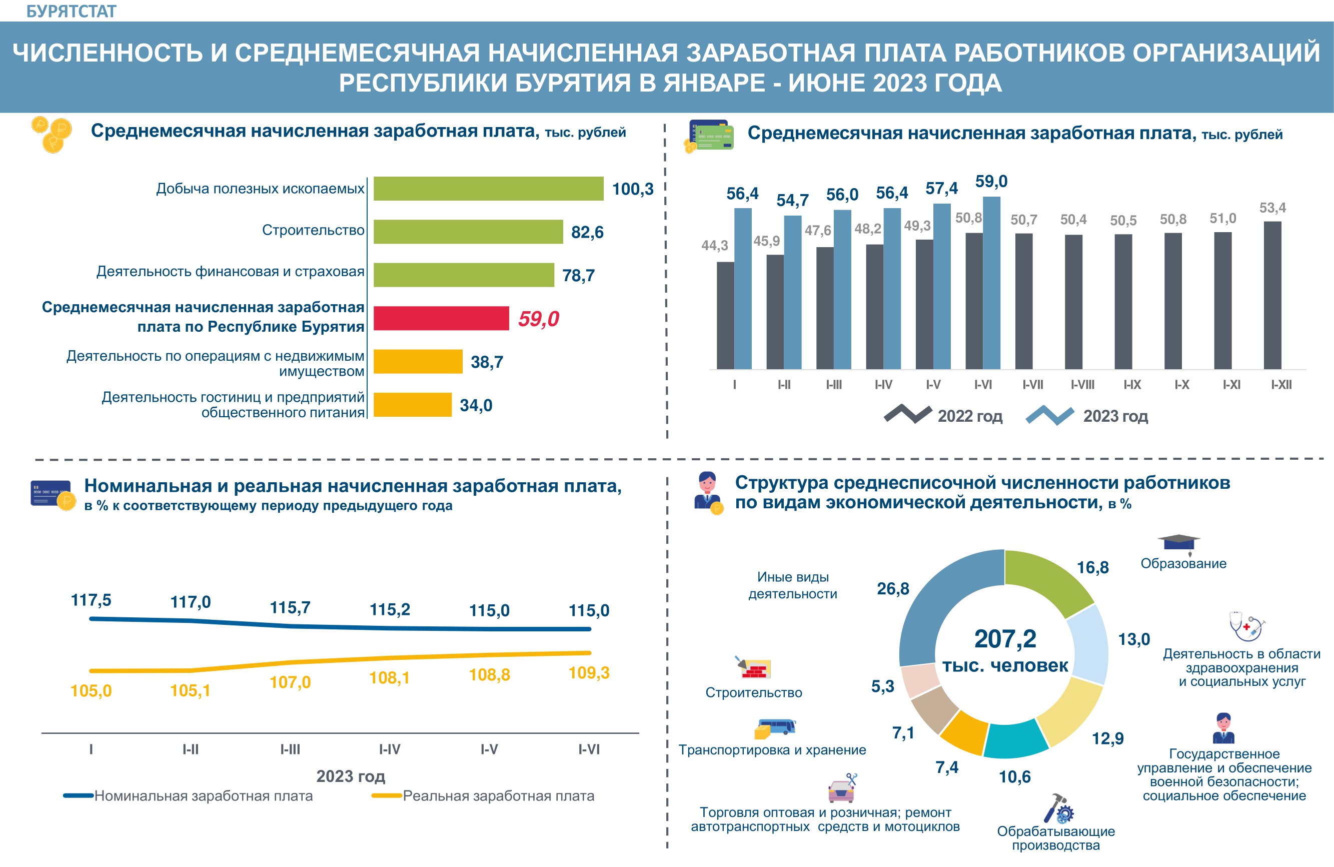 В первой половине 2023 года средняя зарплата в республике, по данным Бурятстата, достигла 59 тысяч 38 рублей (месяцем ранее было 57 432). Это с учётом налогов и других удержаний. За 12 месяцев она возросла на 15%, сообщили в ведомстве.