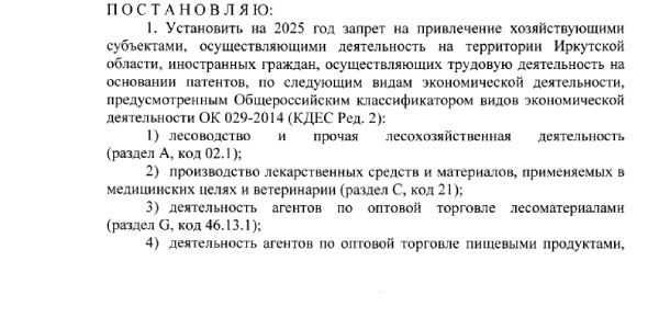 «Установление на 2025 год запрета на привлечение хозяйствующими субъектами, осуществляющими деятельность на территории Иркутской области, иностранных граждан, осуществляющих трудовую деятельность на основании патентов, по отдельным видам экономической деятельности», - говорится в указе.