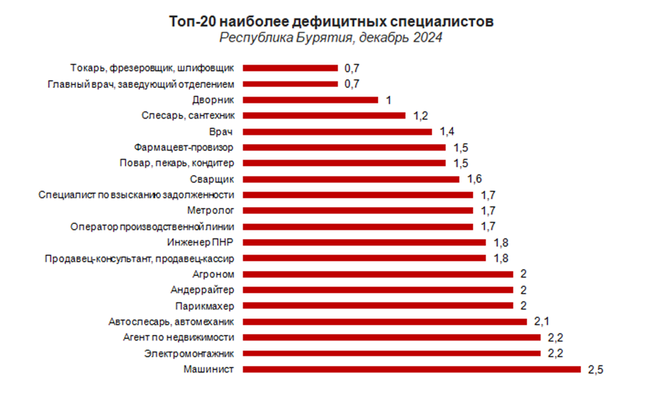 Эксперты российской платформы онлайн-рекрутинга HeadHunter обнародовали самых дефицитных специалистов в Бурятии. Наиболее жёсткая конкуренция среди работодателей в республике сегодня наблюдается за токарей, фрезеровщиков, шлифовщиков, главных врачей и заведующих отделениями больниц, дворников, слесарей, сантехников, врачей, фармацевтов-провизоров, поваров, пекарей, кондитеров и сварщиков.