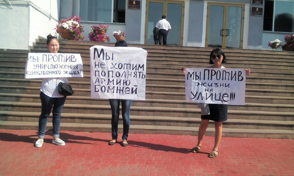 С плакатами: «Мы против жизни на улице!», «Мы против уничтожения единственного жилья!», «Мы не хотим пополнять армию бомжей», возле администрации Улан-Удэ, прямо перед сессией городского совета депутатов около 13.30 часов, выстроились жители СНТ «Цагатуй».
