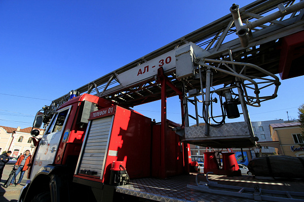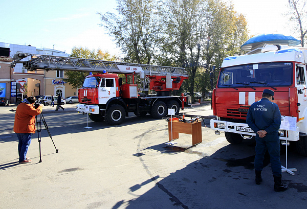 На площади Революции 1905 г. были выставлены в ряд современная пожарная техника и аварийно-спасательное оборудование, предназначенные для тушения пожаров и спасения людей.