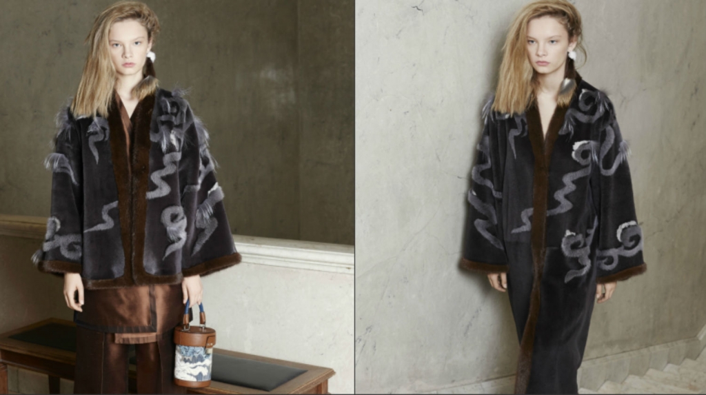 Картины азиатской природы находят продолжение в меховой линии, где создаются за счет техники интарсии с использованием разных видов меха - норки, каракуля и лисы. Другие меховые изделия вдохновлены восточным халатом и декорированы оторочкой – приемом, который также уходит своими корнями в культуру Азии.