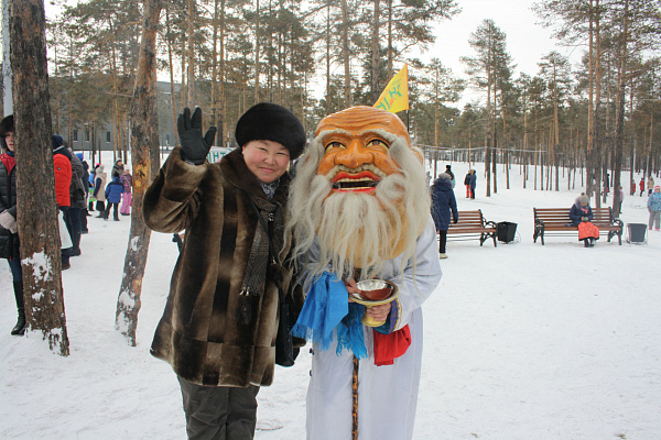 Праздник начался с традиционной встречи Сагаан Убугуна и его свиты. Со сцены Белый Старец под звуки буддийских напевов поздравил присутствующих с наступившим праздником Сагаалган, зажег благовоние и помолился за всех присутствующих. Дети с большим интересом наблюдали за происходящим.