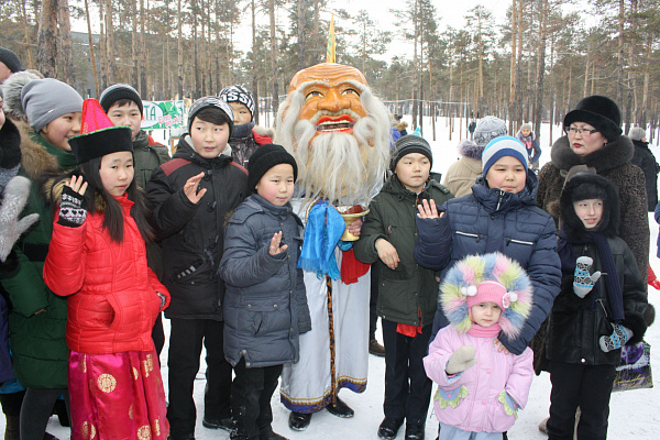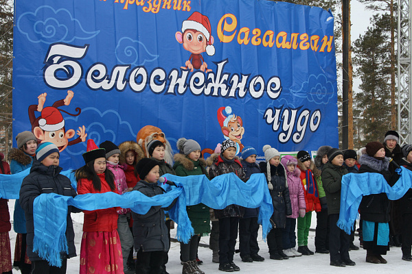 Праздник начался с традиционной встречи Сагаан Убугуна и его свиты. Со сцены белый старец под звуки буддийских напевов поздравил присутствующих с наступившим праздником Сагаалган, зажег благовоние и помолился за всех присутствующих. Дети с большим интересом наблюдали за происходящим.