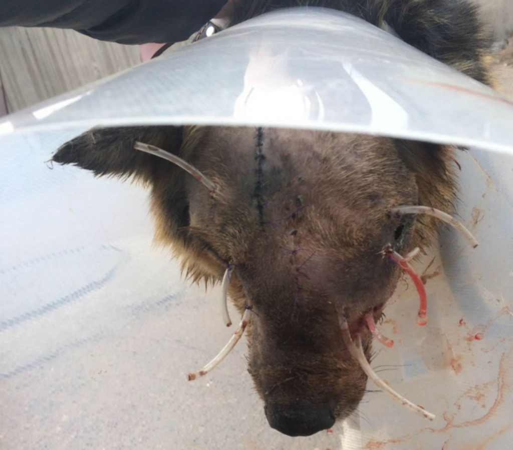 В клинике врачи обнаружили, что правый глаз пса буквально был съеден слизью и закрыт отёком. Вследствие травмы осложнение пошло на гайморовы и лобные пазухи, что привело к синуситу и сильнейшему гаймориту. В день поступления в клинику ветеринары откачали у животного 1,5 литра жидкости.