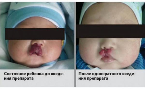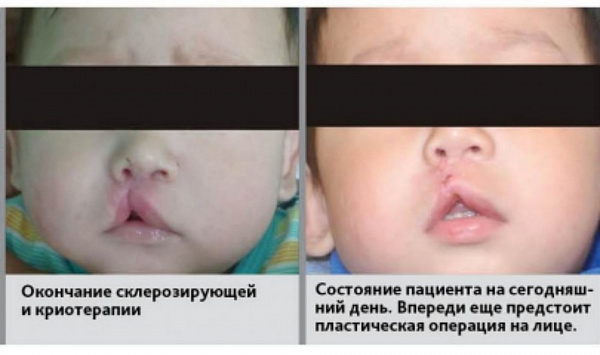 «Наиболее простым, эффективным и малозатратным методом лечения гемангиом на сегодняшний день является склерозирующая терапия. Следует отметить, что в литературе в качестве склерозирующего препарата до сих пор приводится 70 градусный спирт, однако его применение малоэффективно, трудоемко, а также сопровождается прошиванием гемангиом, после чего на лице остаются деформирующие рубцы. Поэтому мы предпочли 1-3% раствор тромбовара, который применяется при варикозной болезни вен нижних конечностей. После снятия тромбовара с производства мы перешли на аналогичные препараты: 1-3% фибро-вейн и 1-3% этоксисклерол», - комментирует доктор.