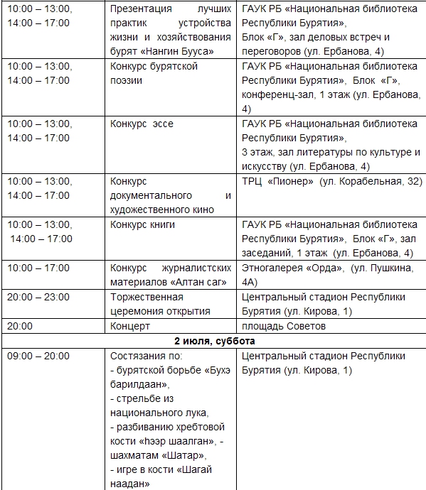 Остальные спортивные состязания состоятся завтра, 2 июля, на Центральном стадионе с 10 до 18 часов. Здесь пройдут соревнования по бурятской борьбе – «бухэ барилдаан», стрельбе из лука, шахматам, разбиванию хребтовой кости – «hээр шаалган», игре в кости – «шагай наадан». В них примет участие 1192 человека.