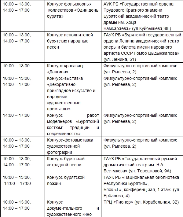 Сегодня, 1 июля, стартуют конкурсы и выставки «Алтарганы». Как отмечали организаторы, среди творческих конкурсов особой популярностью пользуются конкурс красавиц «Дангина» и конкурс модельеров «Бурятский костюм: традиции и современность». Оба конкурса пройдут в Физкультурно-спортивного комплексе.