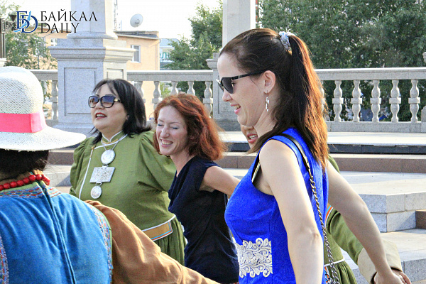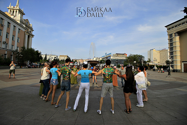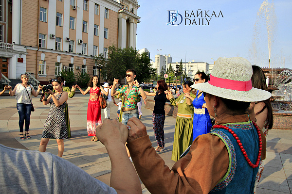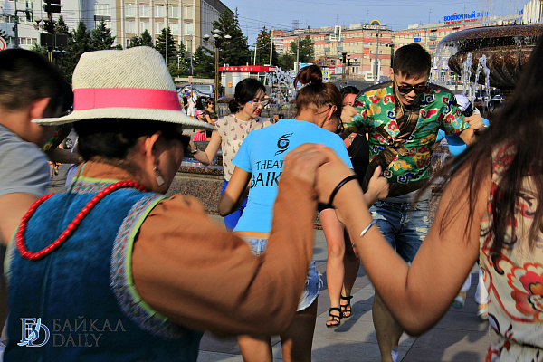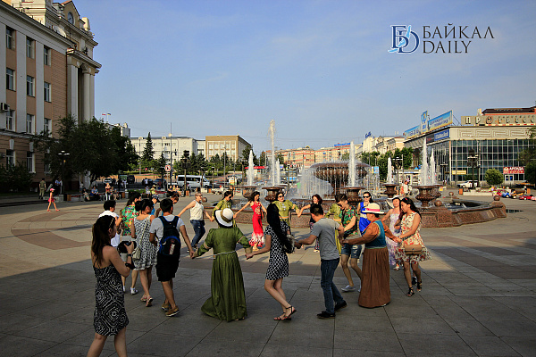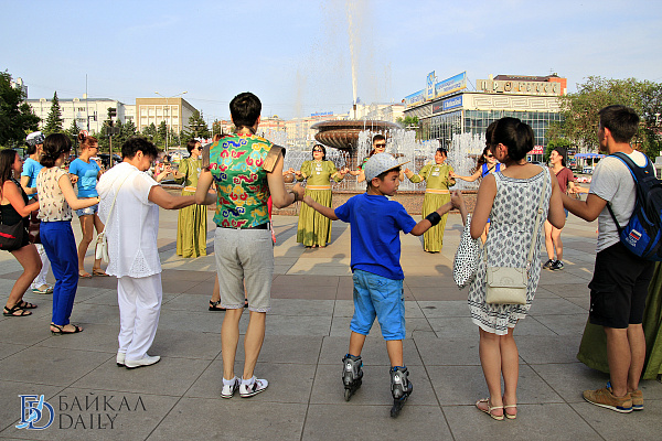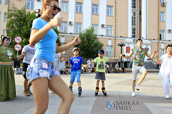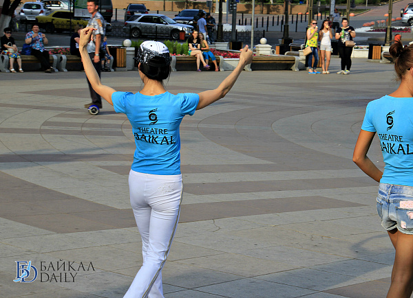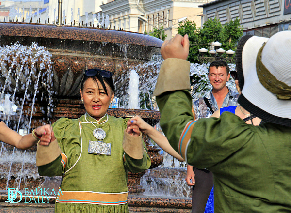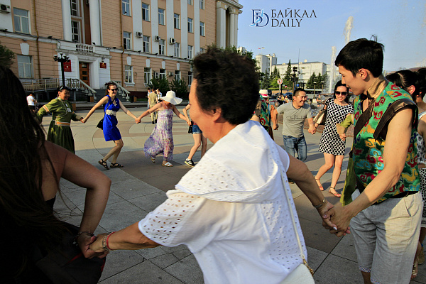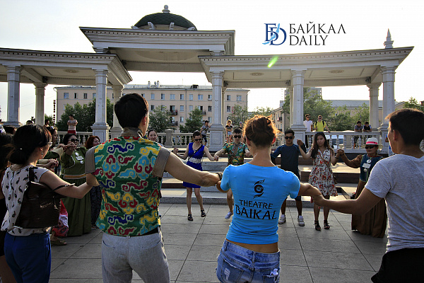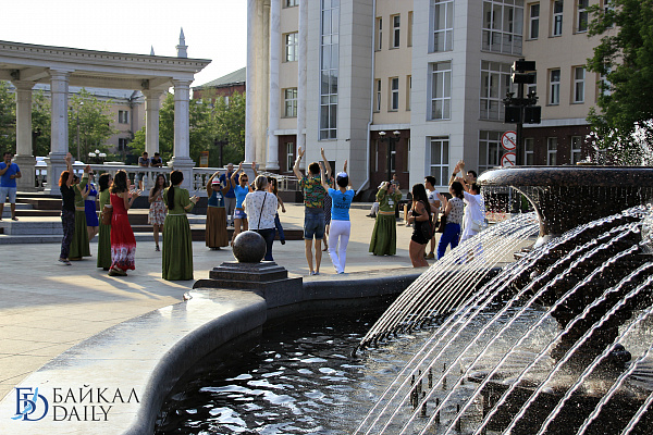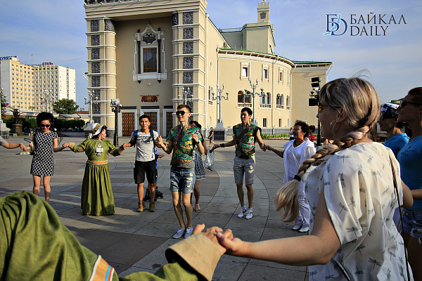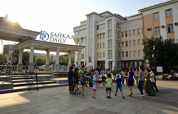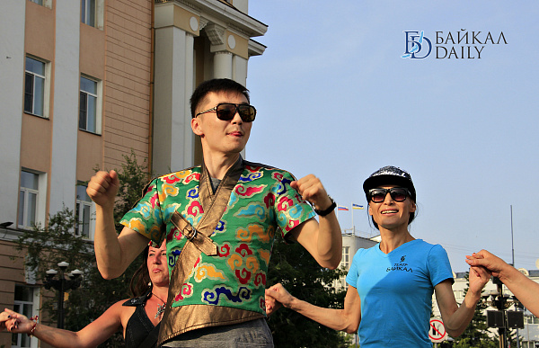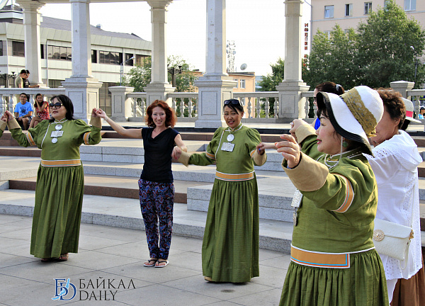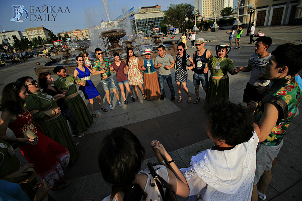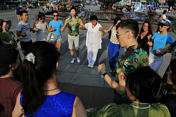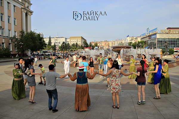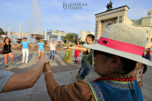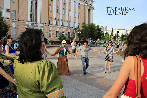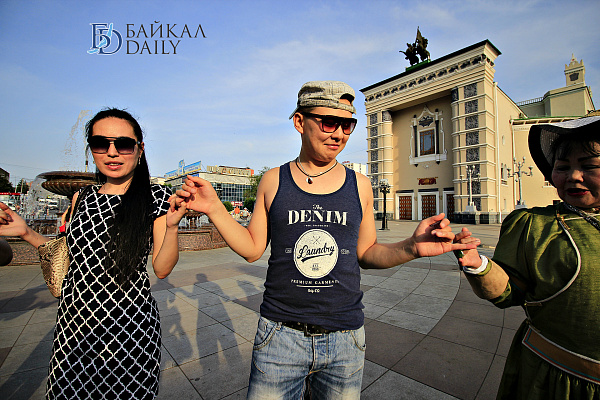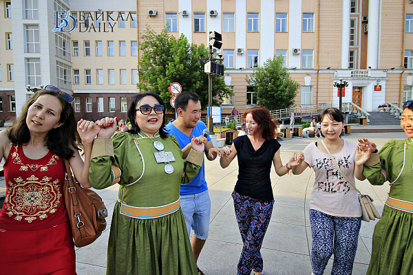 Накануне артисты театра «Байкал» в национальных костюмах устроили бесплатный тренинг по ёхору. Он состоялся вечером на площади у театра оперы и балета. Поучиться ёхору могли желающие, в том числе пожилые люди и дети.