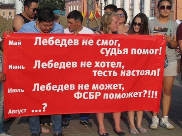 Акция проходила под лозунгами «Богомоев – наш чемпион!» и «Лебедев не может – Алроса поможет». Ближе к концу акции активисты развернули ещё один баннер.