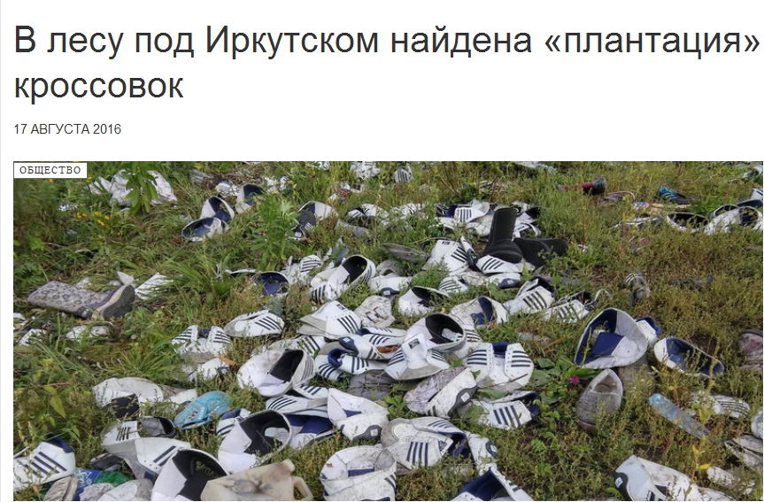 О свалке неизвестного бренда «Baykal sport» сообщили очевидцы в группе «Подслушано Иркутск» «Вконтакте». Вместе с верхними частями кроссовок в лесу на Московском тракте встречается и другая обувь – кеды, резиновые сапоги, уги – а также бытовой мусор.