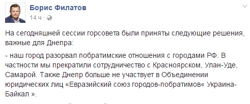 - Десять минут назад горсовет сессионным решением разорвал «побратимские» отношения с городами Российской Федерации», — написал мэр города Борис Филатов на своей странице в Facebook.
