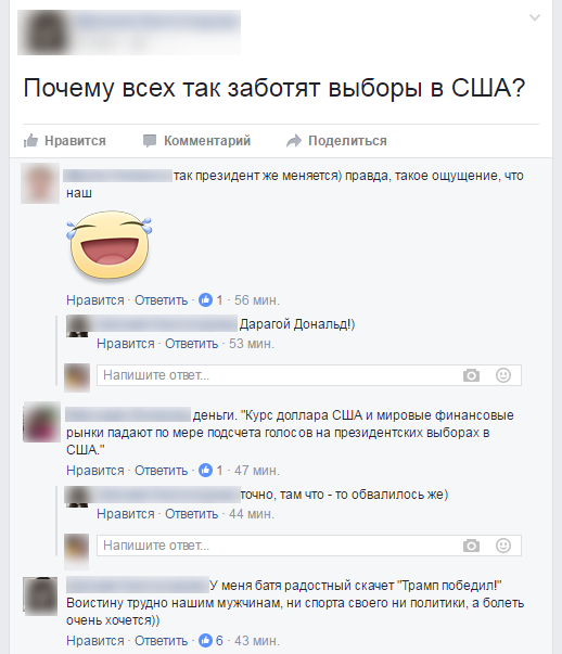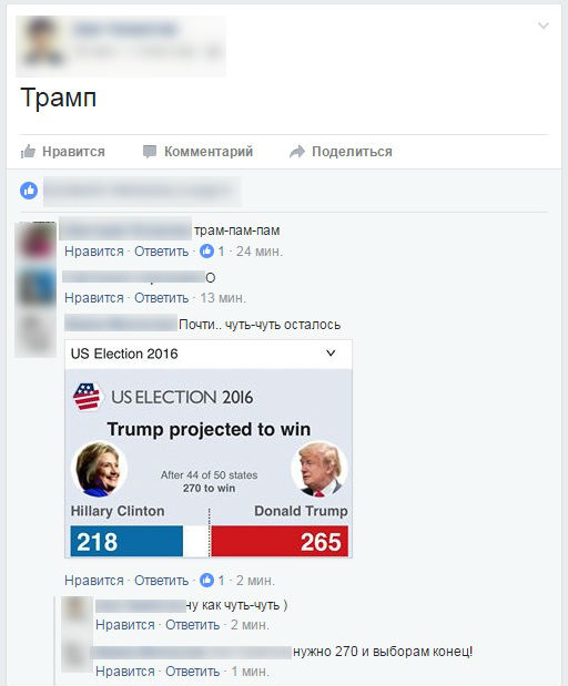 «Трамп = Mr. President», «Грядут перемены», «С детства за Трампа», «Я, конечно, офигел. Бизнесмен стал президентом», «Ура-Ура! С новым президентом Трампом!», «И не сомневалась, что он победит», «Молодец Дональд, так держать!», - писали в соцсетях жители республики.