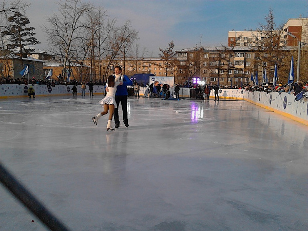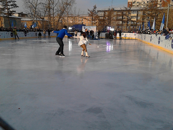 Разрезали ленточку нового катка экс-чемпионы мира по фигурному катанию Мария Петрова и Алексей Тихонов. Они продемонстрировали собравшимся улан-удэнцам номер, подготовленный для шоу Ледниковый период.