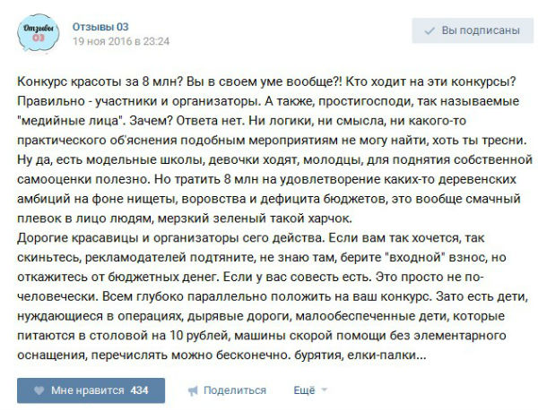 - Вот мы повозмущаемся в соцсетях, между друзьями и коллегами обсудим какое у нас правительство, а на самом деле этого ничего не даст. Кто нас спрашивает? Действительно 8 млн сумма огромная, лучше бы конкурс устроили на образование за счёт государства, на отопление в домах, не говоря уже об операциях больным деткам и пожилым. Все для показухи делается, чтоб остальные регионы или страна в целом думала, что в Бурятии все хорошо, раз конкурсы на такие суммы проводят, а на самом деле проблем масса, от которых этим событием отводят глаз