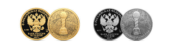 Серебряная монета номиналом 3 рубля выпускается тиражом 10 тысяч штук, золотая монета номиналом 50 рублей – тиражом 5 тысяч штук. На оборотной стороне обеих монет расположено рельефное изображение Кубка конфедераций FIFA на фоне российского фольклорного орнамента. Внизу по окружности – надпись «Кубок конфедераций FIFA 2017», сообщает Центробанк.