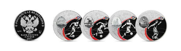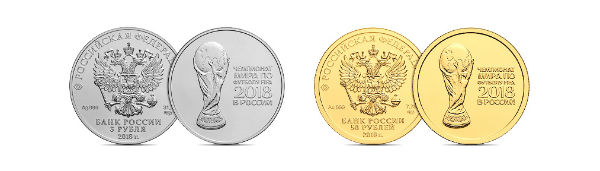 Кроме того, выпускаются инвестиционные монеты: серебряная номиналом 3 рубля и золотая номиналом 50 рублей, посвященные проведению в России в 2018 году чемпионата мира по футболу. На оборотной стороне монет расположено рельефное изображение Кубка мира, справа – надпись «Чемпионат мира по футболу FIFA 2018 в России». Тираж серебряной монеты – до 300 тысяч штук, золотой – до 100 тысяч штук.